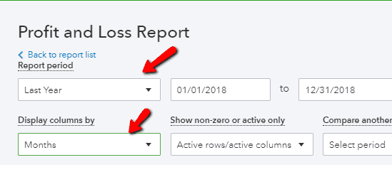 6. Next, review your Profit and Loss statement. Use the dates 1/1/2021 to 12/31/2021. Under the ‘display columns by’ drop-down, select months. Look at the income accounts first and make sure everything is in its proper place.  Then scan the rest of the report and make sure the category and amounts make sense to you. (See the screenshot and video below.)